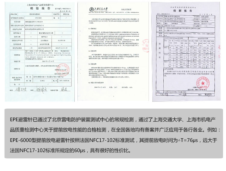 EPE系列提前放電避雷針(以下簡稱EPE避雷針)采用法國技術(shù),符合法國NFC17-102標(biāo)準(zhǔn)。它由三種系統(tǒng)(大氣電力電容器、高壓脈沖發(fā)送系統(tǒng)、電流泄放系統(tǒng))組成,具有雙重瞬間放電裝置,被多層的具有隔絕惡劣環(huán)境及水密性的材料所保護(hù);無老化危險,免維護(hù)。在相同的安裝高度下,比普通瞬間避雷針的保護(hù)半徑大數(shù)倍,搶先放電時間為30μs~60μs,即優(yōu)先引雷入地。