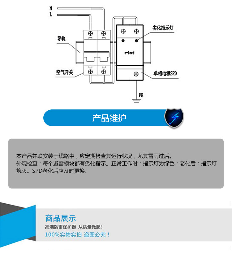 1. 已有可靠接地系統(tǒng),在配電柜(避雷器安裝處)的接地樁 (條)上進(jìn)行接地電阻的測(cè)定,電阻應(yīng)符合相關(guān)規(guī)范要求。 (或滿足國家、部級(jí)標(biāo)準(zhǔn))。 2. 配電柜中應(yīng)留有安裝避雷器的空間, 注:L為電源相線;N為電源零線;PE為地線。 | 應(yīng)檢查空氣開關(guān)已經(jīng)合閘導(dǎo)通,以保證避雷器處于運(yùn)行狀態(tài); 不要在雷雨天安裝。 |